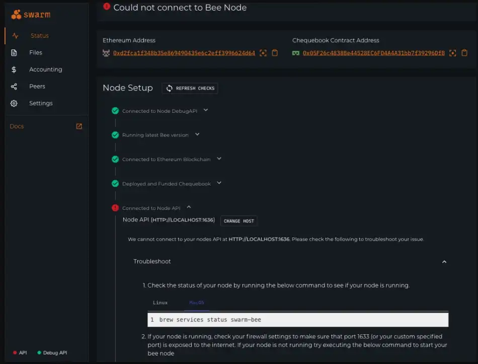 The Bee Dashboard is a web app that can help you set up your Bee node. It connects to your locally running node, checks the status of different API endpoints, and offers troubleshooting.