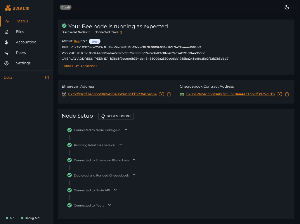 Once your node is working, the status page will display key information such as the version of your Bee node, Ethereum Address, or your PSS public key.
