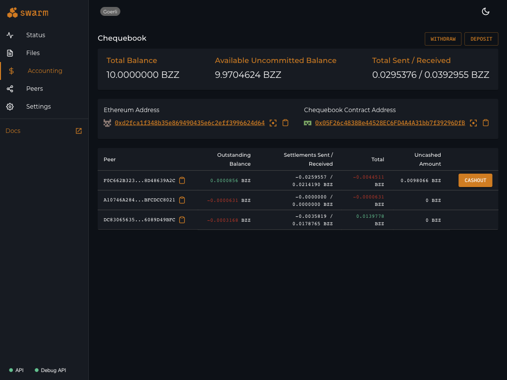 The accounting feature is especially attractive for everyone participating in the Rise of the Bee airdrop. You can now use a user interface to view your peer balances and cash out any outstanding cheques.