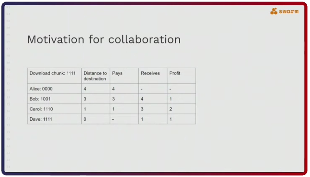 The reason nodes act in this collaborative way is because they are financially motivated to do so. Alice has to pay to receive the desired chunk and the payment amount corresponds to the distance the chunk has to travel. The payment is also dispersed along the forwarding chain so that each node pockets some profit (see figure below). The profit is paid out either in Swarm’s native token, BZZ, or in reciprocal services.