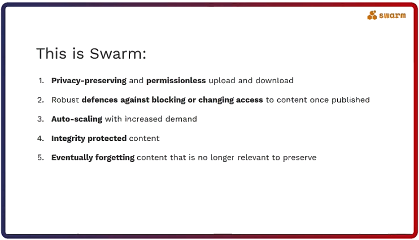 Being this global hard drive gives Swarm some unique properties listed in the figure below.