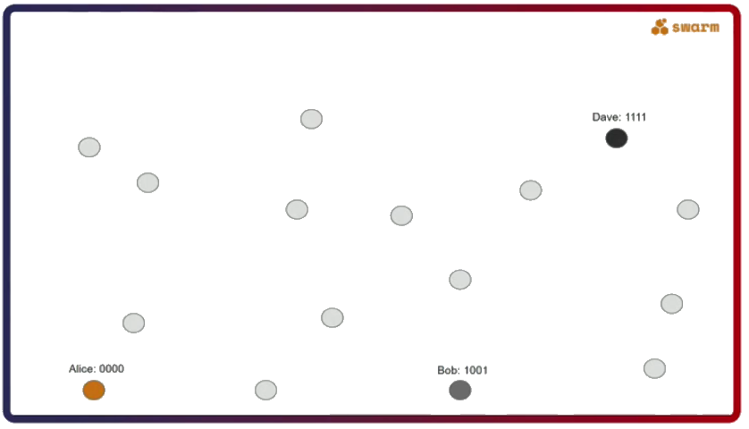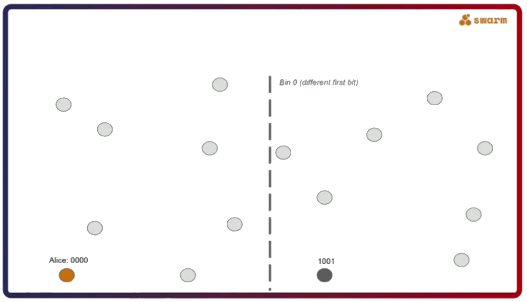 The second important thing about Swarm is that its network uses a specific type of a distributed hash table called Forwarding Kademlia. Let’s say Alice (address 0000) wants to send a message to Dave (address 1111). The question here is, what kind of a connectivity pattern does Alice have to follow to always be able to send a message to Dave?