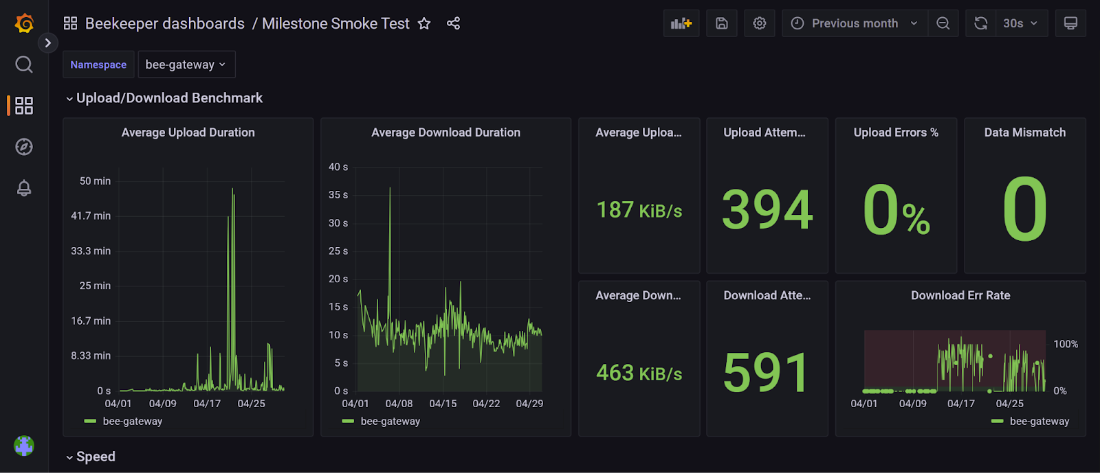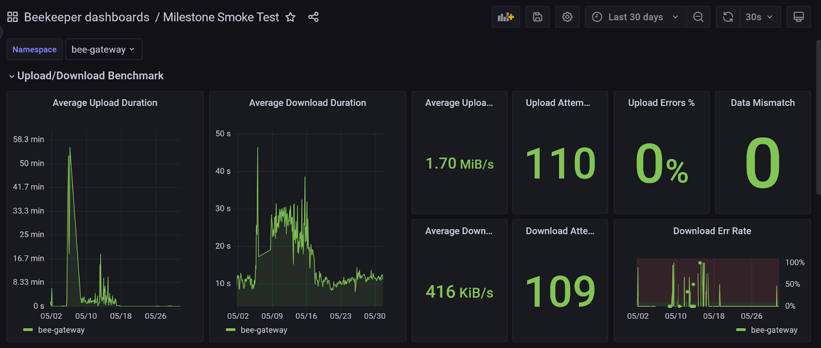 Parallel to the ongoing rollout of the storage incentives system, the Swarm dev team has also been working at improving other aspects of Swarm network performance. Some of the most significant improvements are those related to the push-sync, pull-sync, and retrieval protocols which make up the technical infrastructure responsible for uploading and downloading data from the Swarm network. The teams’ work is reflected in the most recent performance metrics measuring error rates as well as download / upload speeds.