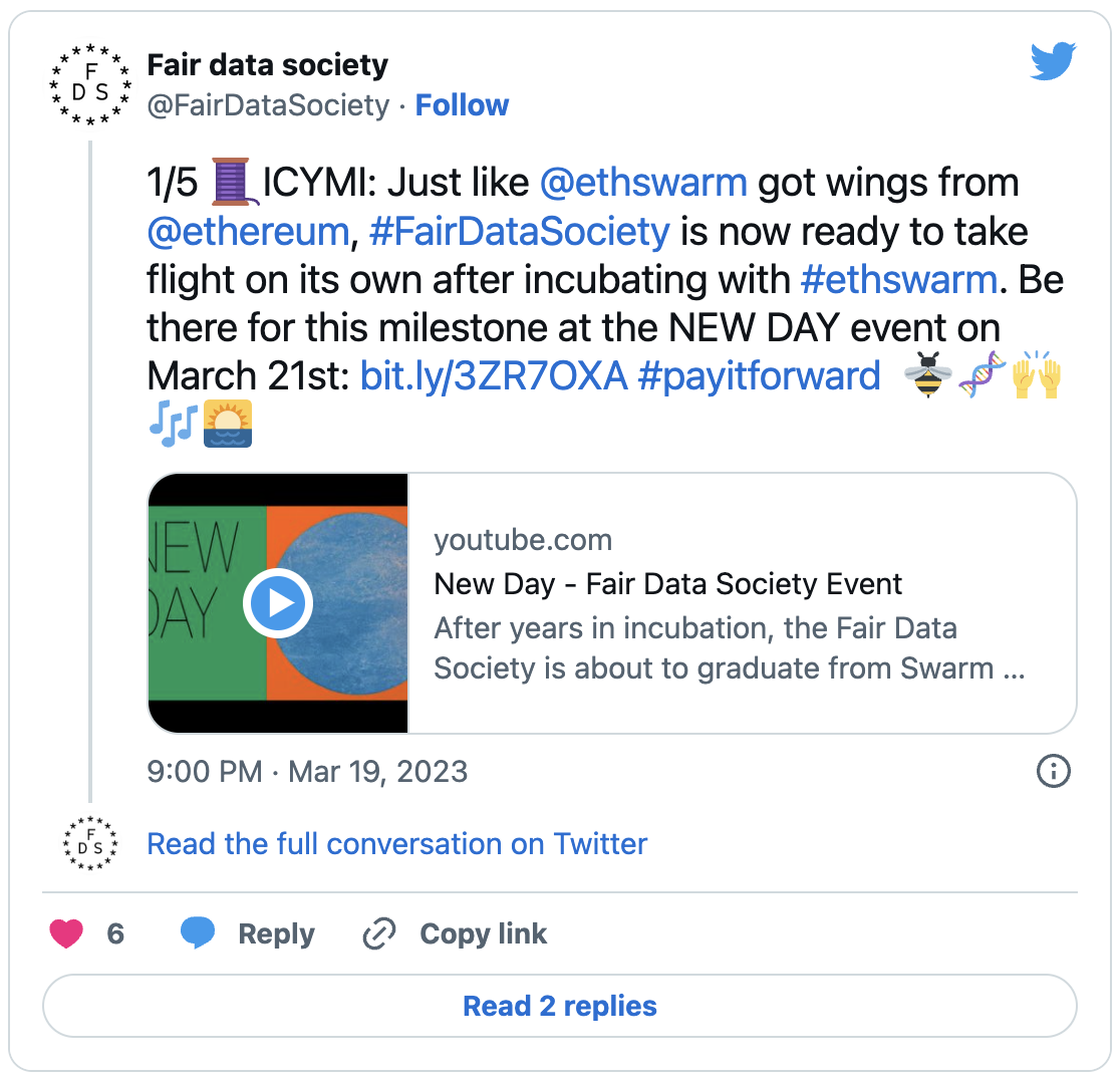 The Swarm Foundation team recognised the possibilities that come with this, and has expressed support for the ethically-driven ecosystem initiative, Fair Data Society, since 2019, while it was still part of the Ethereum Foundation.